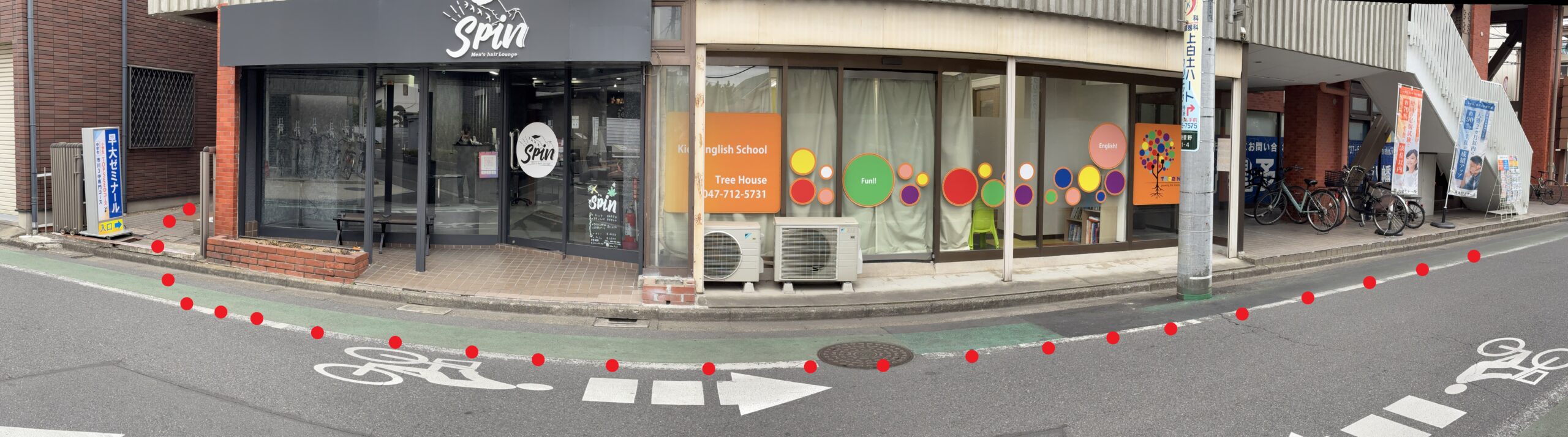 赤枠で印された道路わき階段下、東進衛星予備校前のスペースがが駐輪場になります。